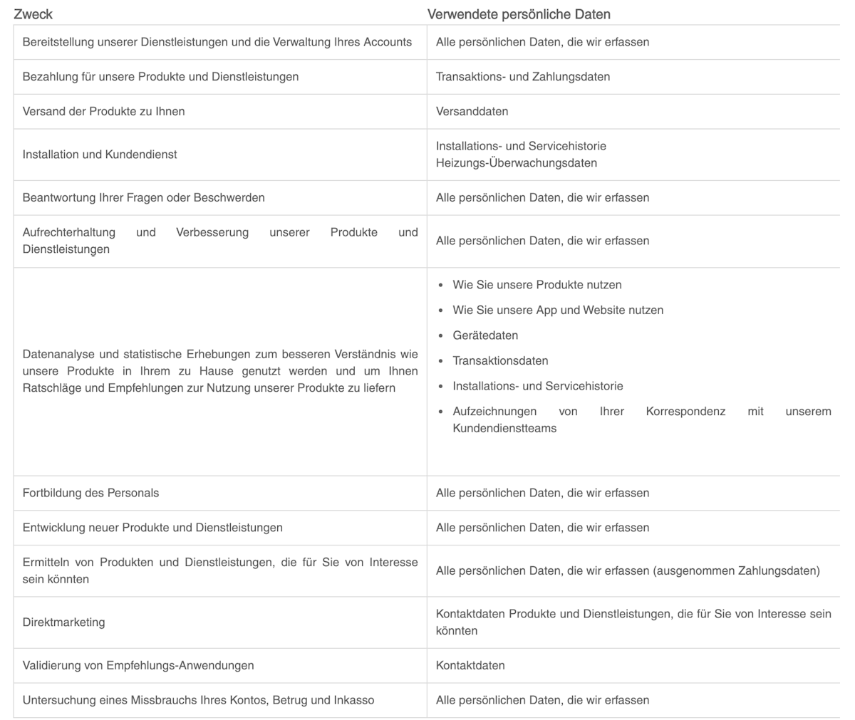 Wir können die folgenden Arten persöhnlicher Daten von Ihnen erfassen, wenn Sie Dienstleistungen oder Produkte von tado° nutzen: