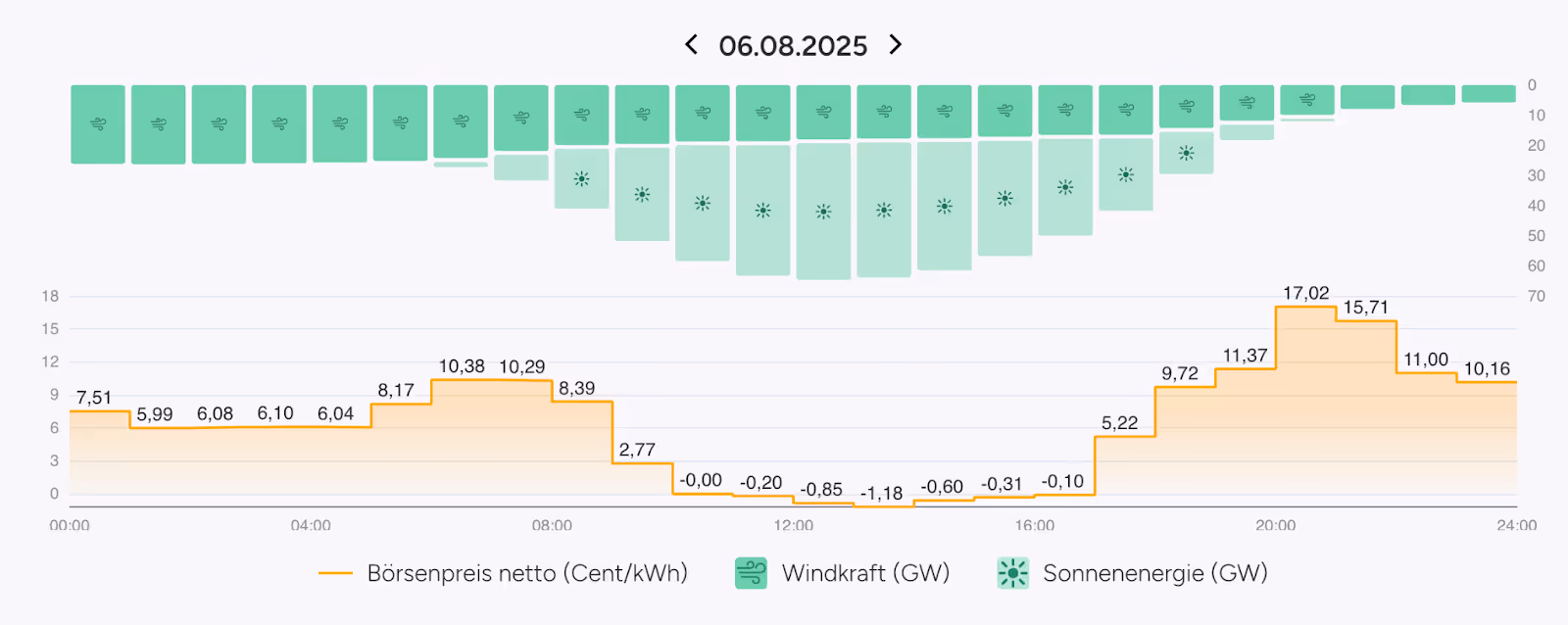 Diese steigende Nachfrage fällt mit den zunehmenden Investitionen Europas in erneuerbare Energien, insbesondere in Solar- und Windenergie, zusammen, die nun zu einem noch nie dagewesenen Überangebot an Strom führen. In diesen Zeiten, oft um die Mittagszeit, sinken die Großhandelspreise für Strom oft unter Null. Dies bietet eine einzigartige Gelegenheit für eine intelligente Energienutzung zuhause.