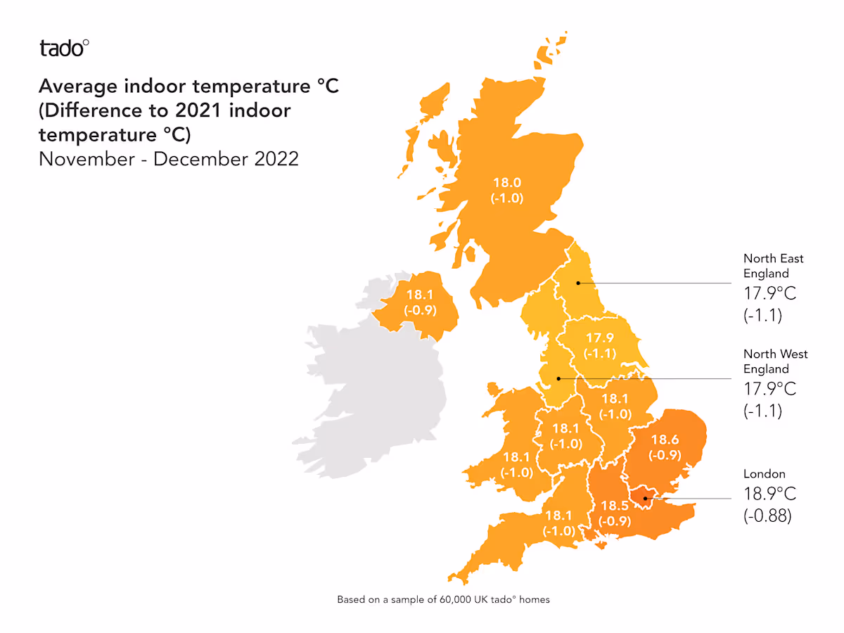 London homes were measured the warmest at 18.9°C, whereas Yorkshire homes were coldeset at 17.9°C, both a drop in 1°C from 2021, as the country struggled to afford heating to its usual comfort level across November and December 2022