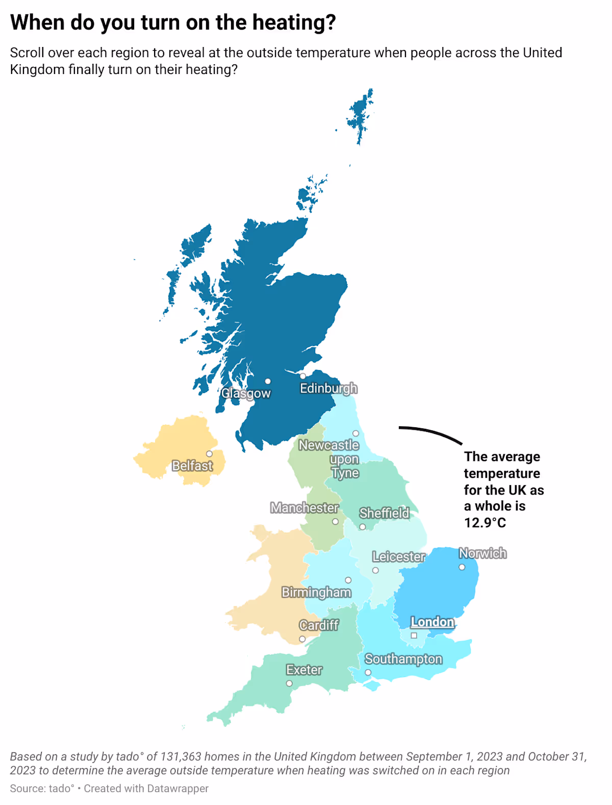 [1] tado° conducted a study of 131,363 homes across the United Kingdom between September 1, 2023 and October 31, 2023. The average results for all areas are: The UK Whole UK 12.87°C; Scotland 11.91°C; East of England 12.54°C; South East England 12.77°C; West Midlands 12.84°C; North East England 12.88°C; London 12.90°C; East Midlands 13.00°C; South West England 13.11°C; Yorkshire and the Humber 13.14°C; North West England 13.23°C; Wales 13.55°C; and Northern Ireland 13.66°C.