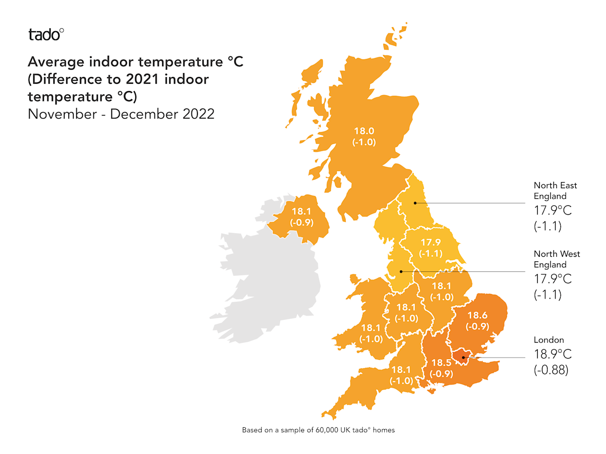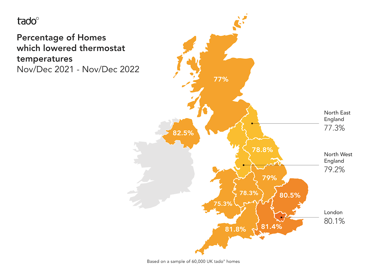 London, 18.01.2023 – As the cost of energy rises throughout Europe and gas supply is under close watch, new data from tado°, the European market leader for intelligent climate management has found that 79.6% of households in the UK turned down their thermostats to lower temperatures, during the months of November and December 2022 when compared to the previous year.