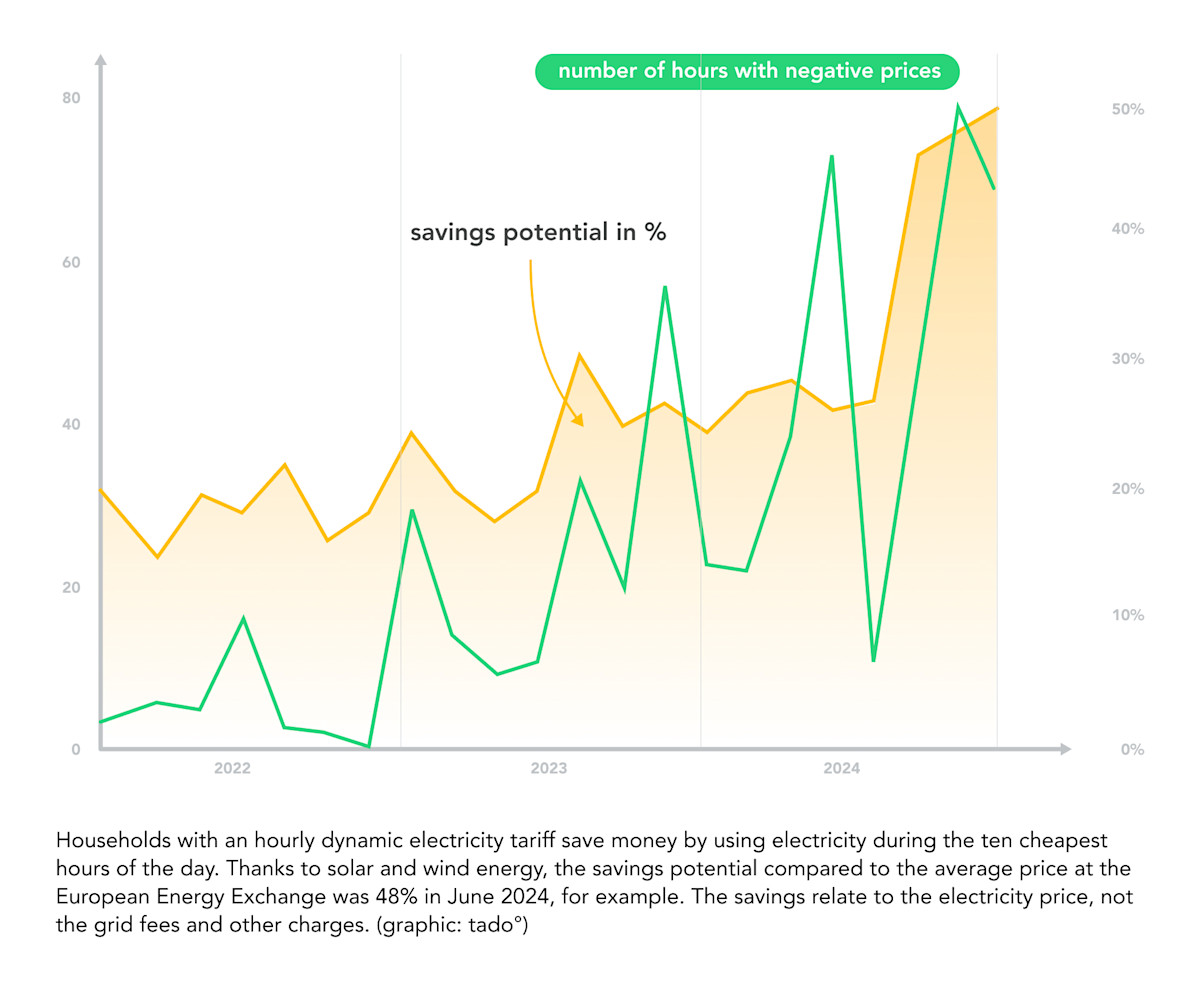 Since 2022, the potential savings on electricity bills have even doubled. Two years ago, it was just 17 per cent. The reason for this is the share of renewable energy in the electricity grid, which reached a new high of 58 per cent in Germany and 50 percent in Europe in the first half of 2024. If a large amount of wind and solar energy is available, the energy price on the European Power Exchange is particularly low or even negative if there is a surplus. Customers are then remunerated for charging their electric car or operating their heat pump.