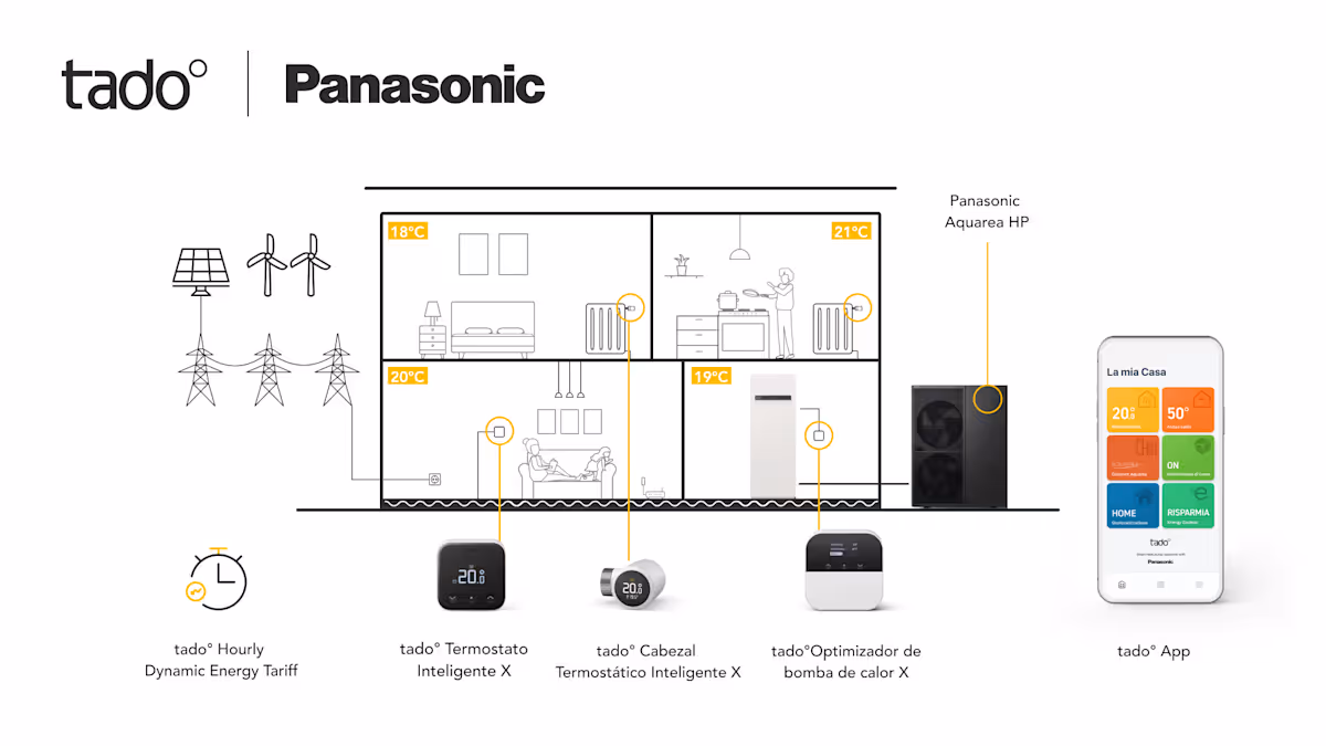 Madrid, 09 de septiembre de 2024 – tado°, proveedor líder de soluciones de climatización y gestión de energía para el hogar, y Heating & Ventilation A/C Company de Panasonic Corporation presentan hoy su primera oferta integrada que tiene como objetivo ofrecer soluciones para bombas de calor inteligentes. Esta colaboración combina las innovadoras bombas de calor AQUAREA de Panasonic con los avanzados sistemas de calefacción inteligente de tado° X.