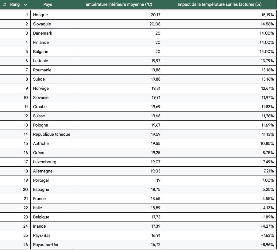 L’analyse met en évidence un contraste net entre les logements les plus chauds et les plus frais d’Europe. La Hongrie, la Slovaquie et le Danemark affichent les températures intérieures moyennes les plus élevées, avec des logements chauffés autour de 20 °C ou davantage, tandis que le Royaume-Uni, les Pays-Bas et l’Irlande se situent à l’autre extrémité du classement, avec des températures intérieures moyennes inférieures au seuil de 18 °C recommandé par l’OMS 1.