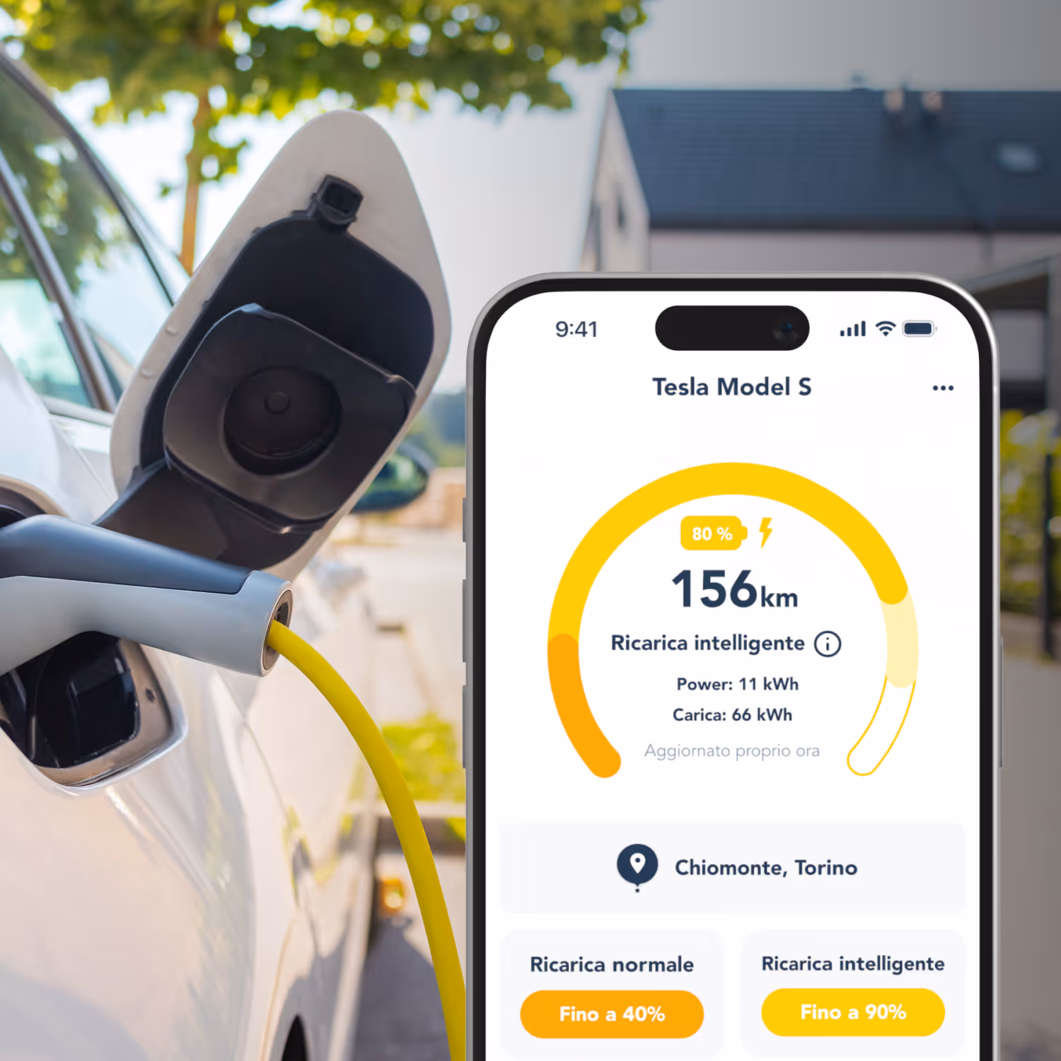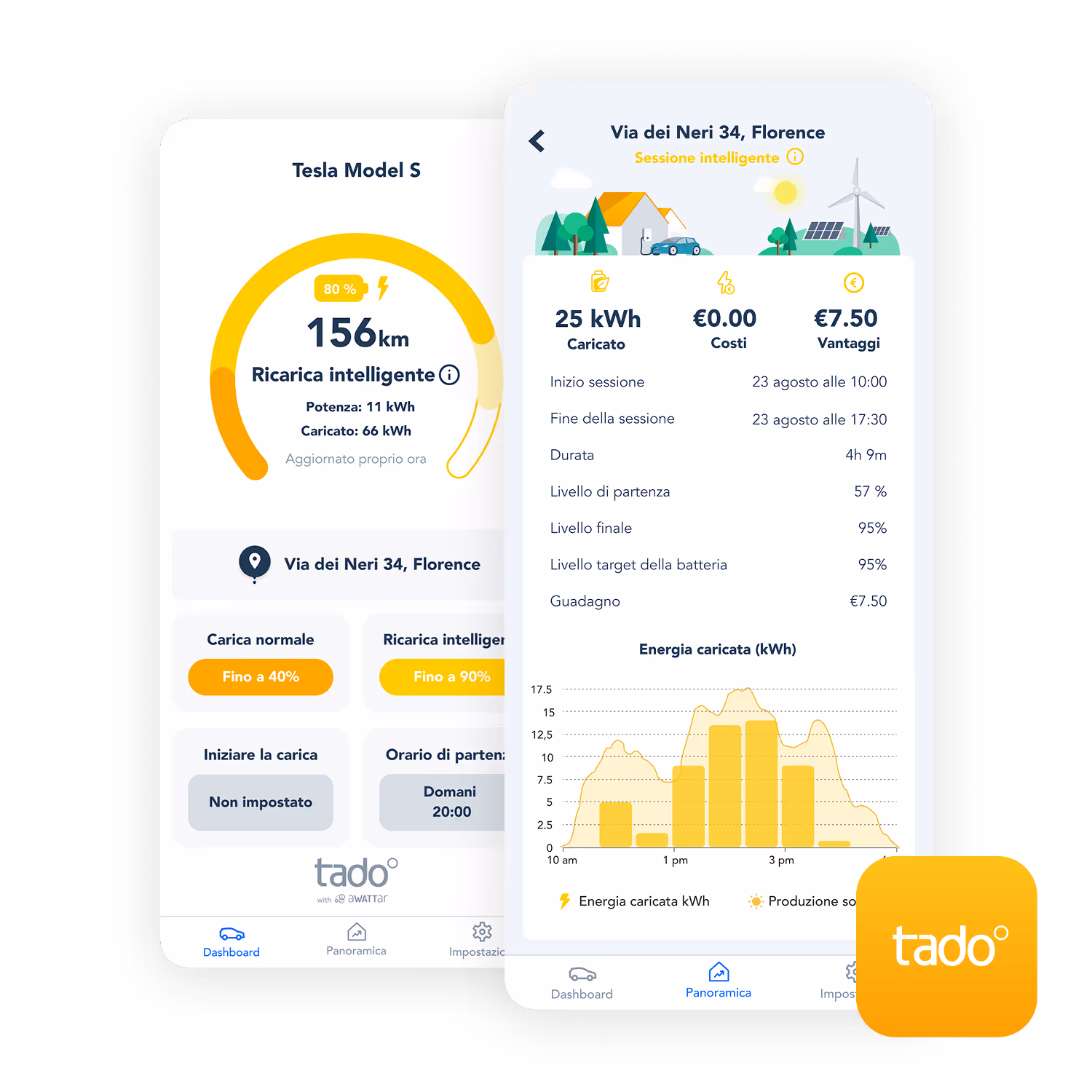 Ricarica la tua auto elettrica con l'energia prodotta dai tuoi pannelli solari, lasciando che tado° si occupi di tutto. Grazie alla nostra tecnologia avanzata, i nostri algoritmi intelligenti rilevano la tua posizione di ricarica e monitorano la produzione del tuo impianto fotovoltaico, ottimizzando l'energia disponibile per ricaricare la tua auto. Se l’energia solare non basta per una ricarica completa durante il giorno, tado° integrerà la ricarica nelle fasce orarie più economiche del tuo contratto energetico.