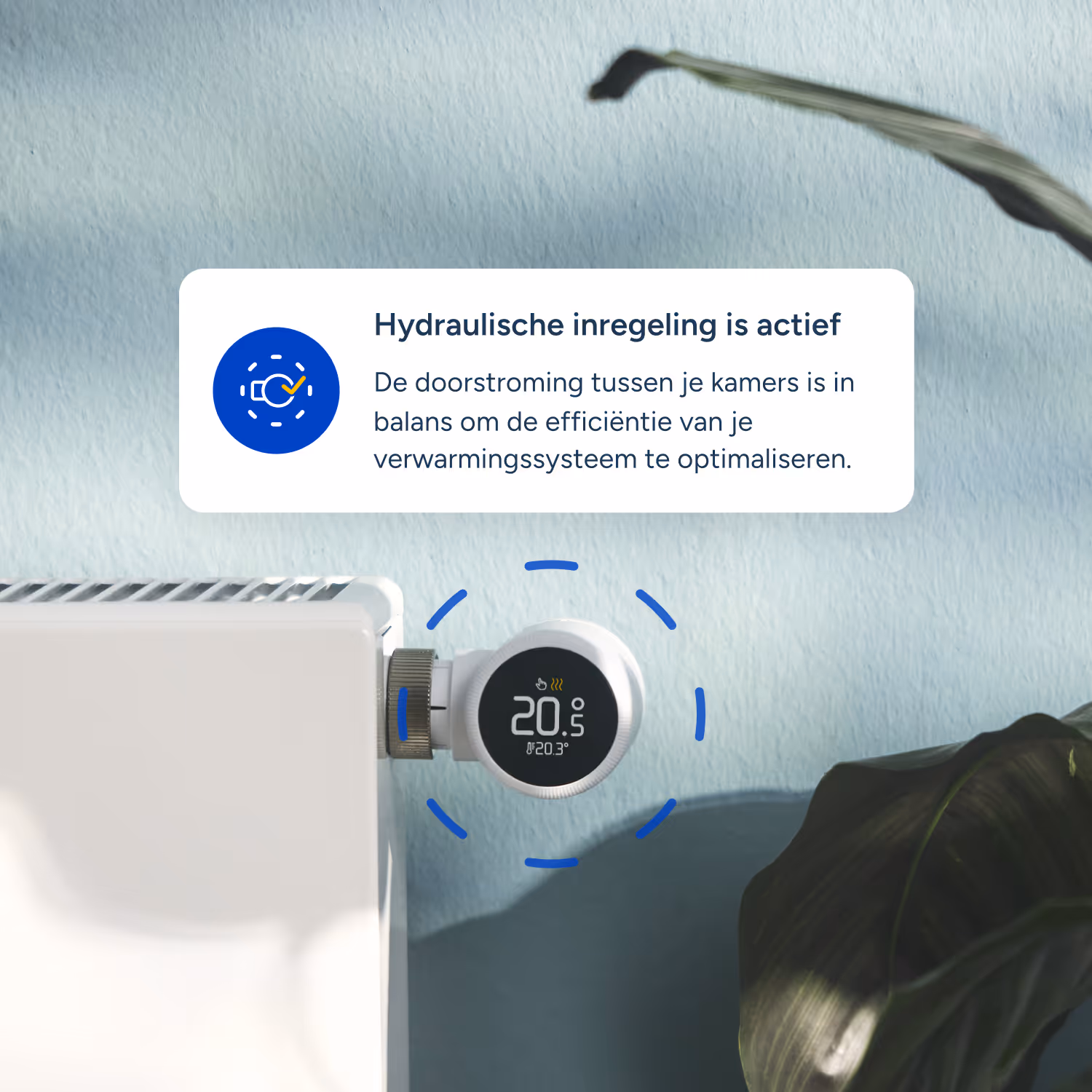 De nieuwe hydraulische balancering zorgt ervoor dat er altijd de juiste hoeveelheid water in elke radiator zit voor de beste warmteverdeling, zonder dat er kleppen vervangen hoeven te worden. Dit maakt de installatie sneller, goedkoper en makkelijker. (Beschikbaar vanaf november 2025.)